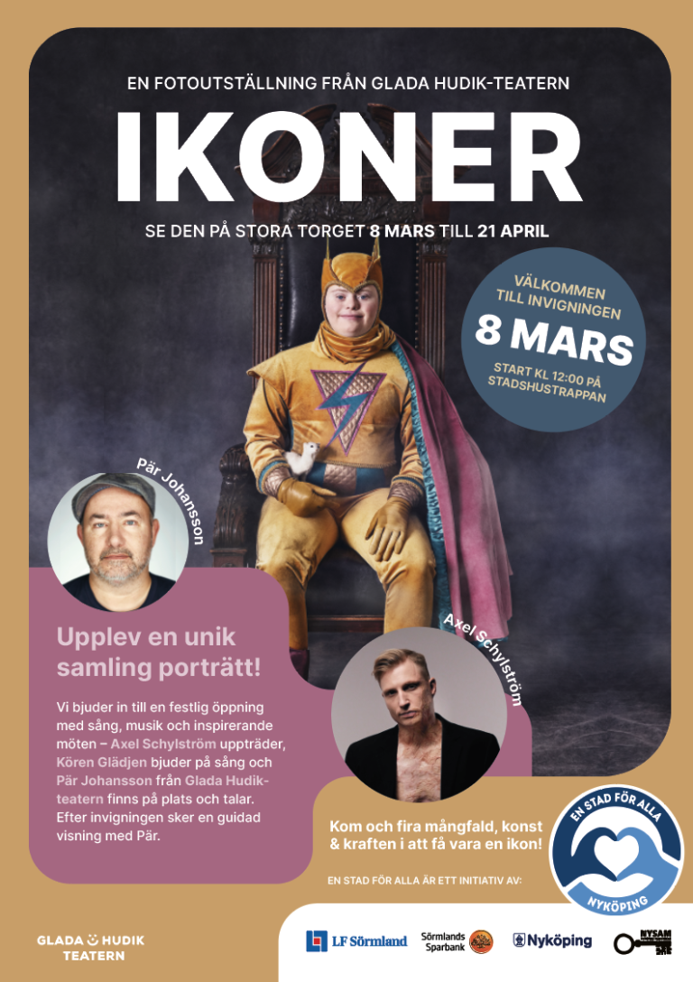 Under mars och april kommer fotoutställningen Ikoner att visas på torget i Nyköping. Den handlar om att få finnas och att få ta plats oavsett vem du är. För vem bestämmer egentligen vem som är vacker, vem som är cool och vem som får visas på museum? Utställningen består av 21 porträtt där alla modellerna har Downs syndrom.